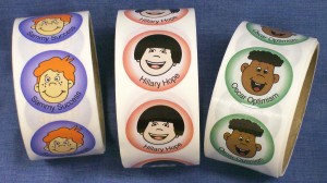 Round stickers with the Kids at Hope friends Hillary Hope, Oscar Optimism and Sammy Success in full color.